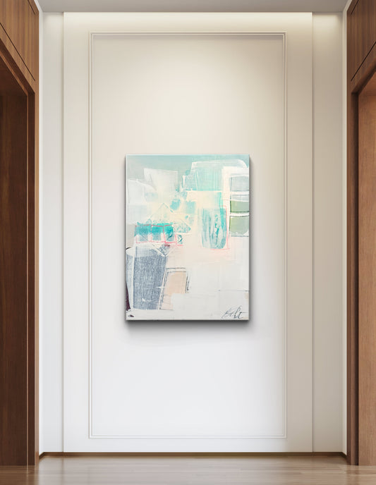 Original Abstract Mixed Media Landscape Painting, Blue, Green, Pink, Abstract Artwork, 30”x40”