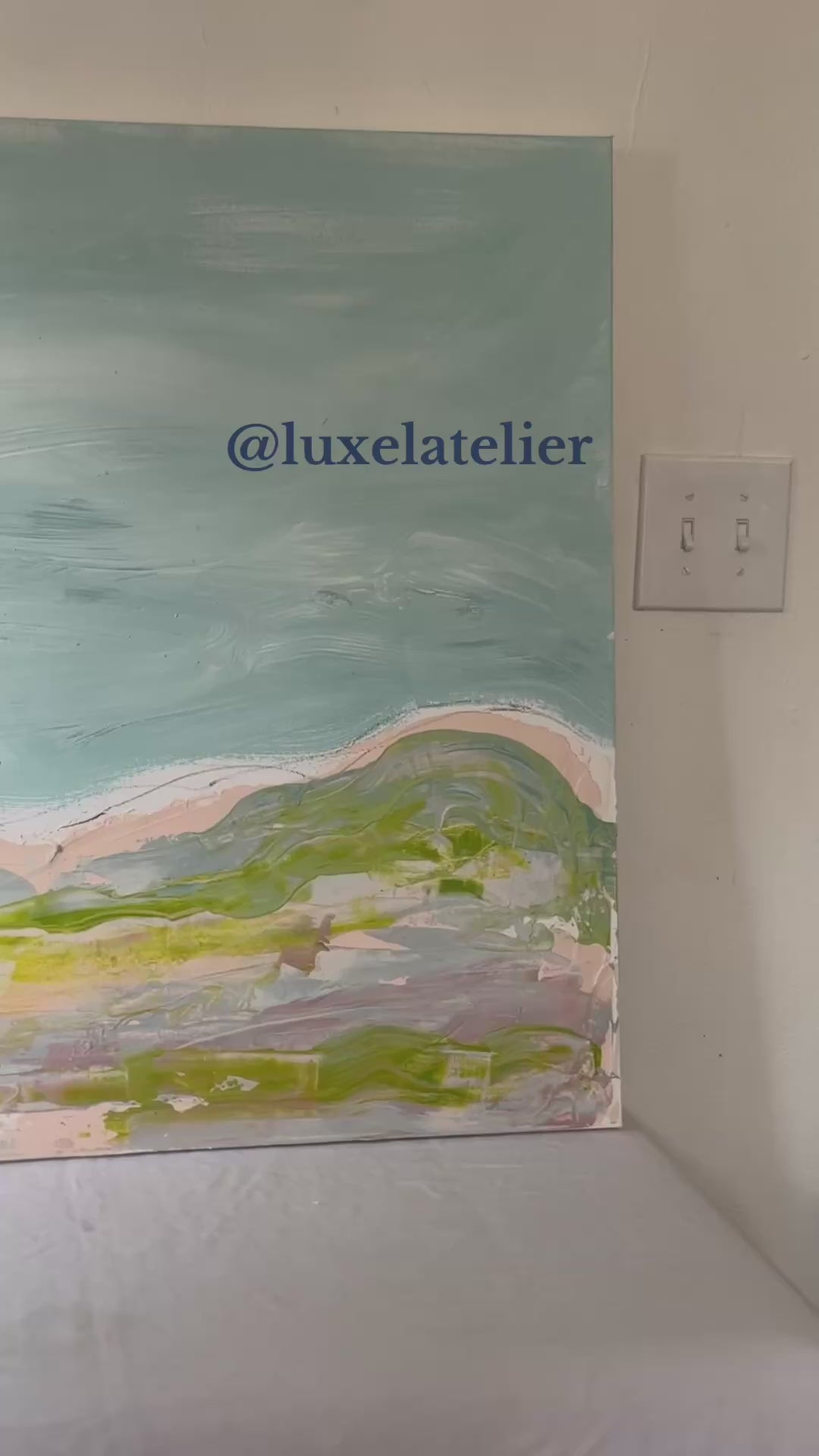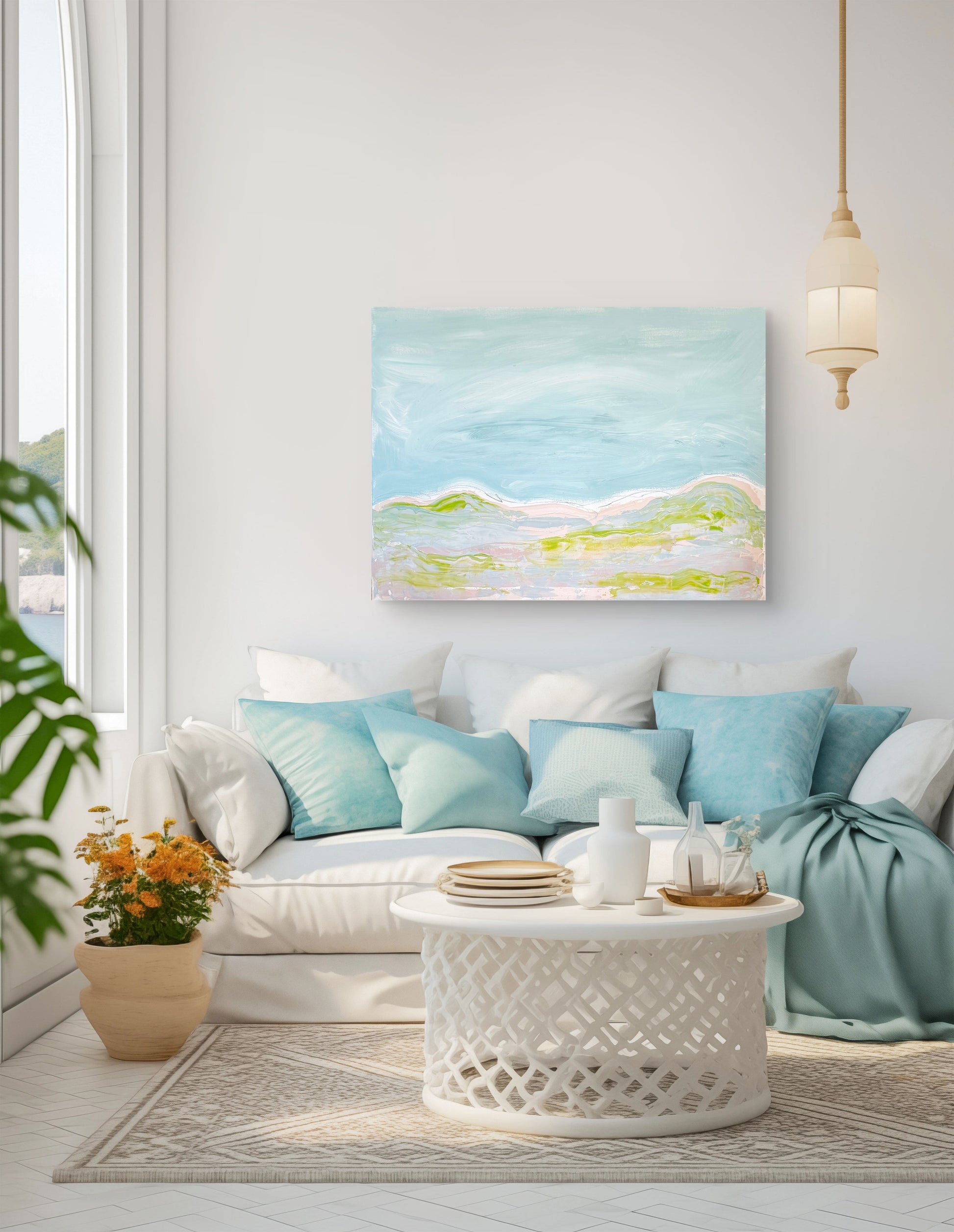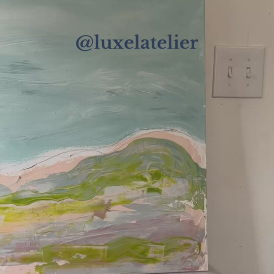 Transform your home into a canvas of whispered dreams with this original abstract mixed media landscape painting from Luxe L'Atelier. At 30”x40” on a premium stretched canvas, it unfolds layers of muted blue skies, lush green horizons, and soft pink sunsets, accented by vibrant pops of chartreuse that dance like fleeting fireflies. The rich texture—built from layered mixed media—invites touch and tells stories of untamed nature reimagined in fluid, evocative forms, blending minimalist serenity with bold, organic energy.