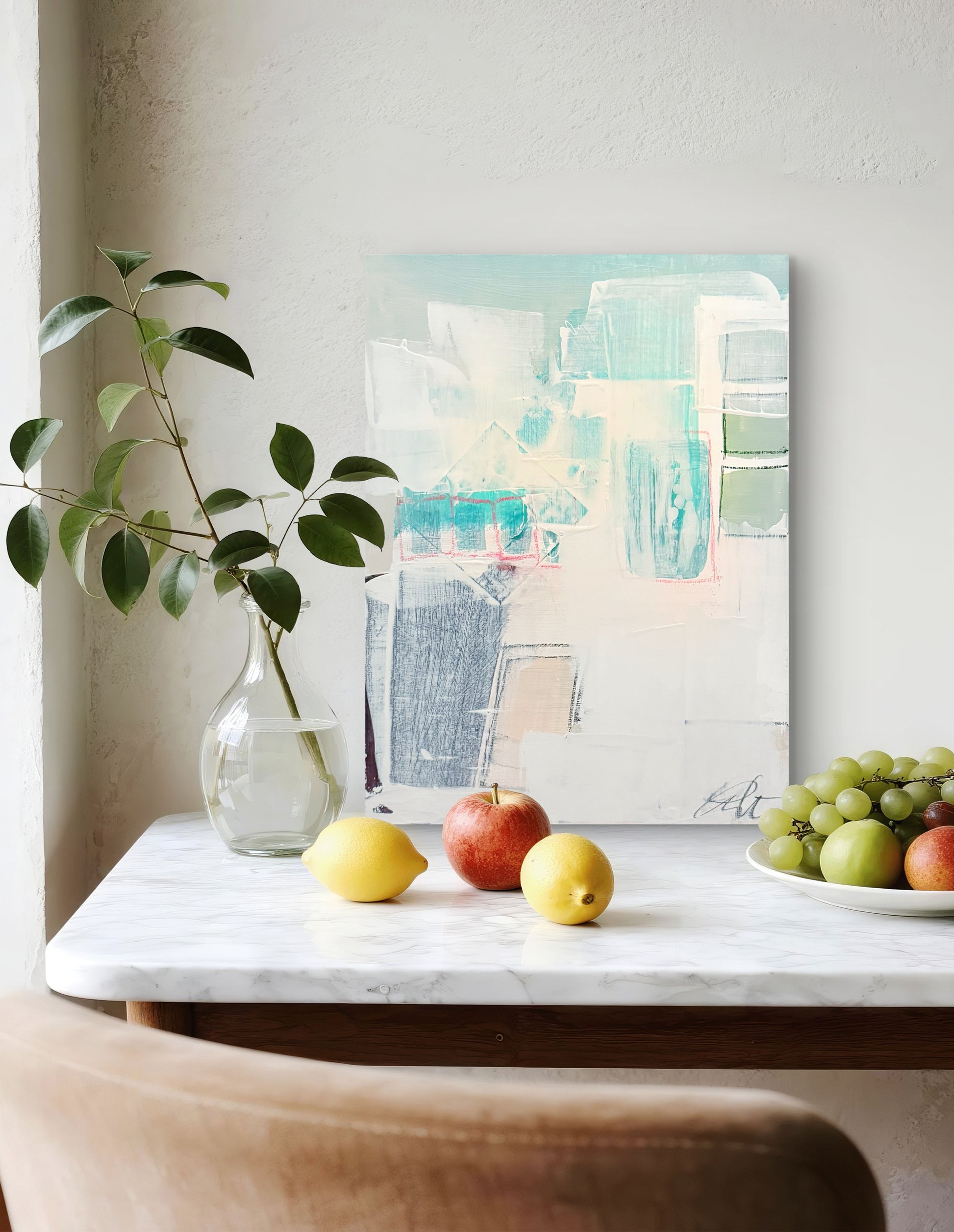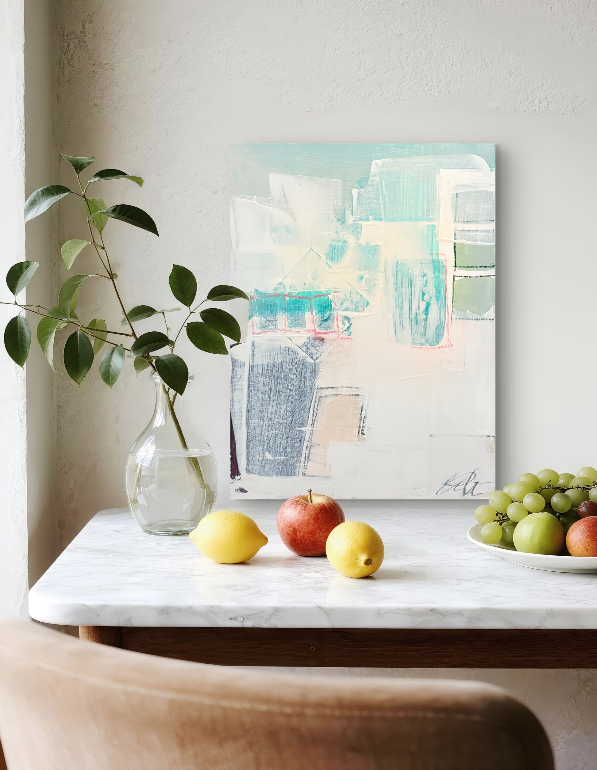 Original Abstract Mixed Media Painting on Canvas, 18”x24”x1.5”. Primary colors are shades of turquoise, pink, white and touches of black charcoal. This painting is the perfect compliment to almost any space in your home with its neutral color palette and interesting design.
