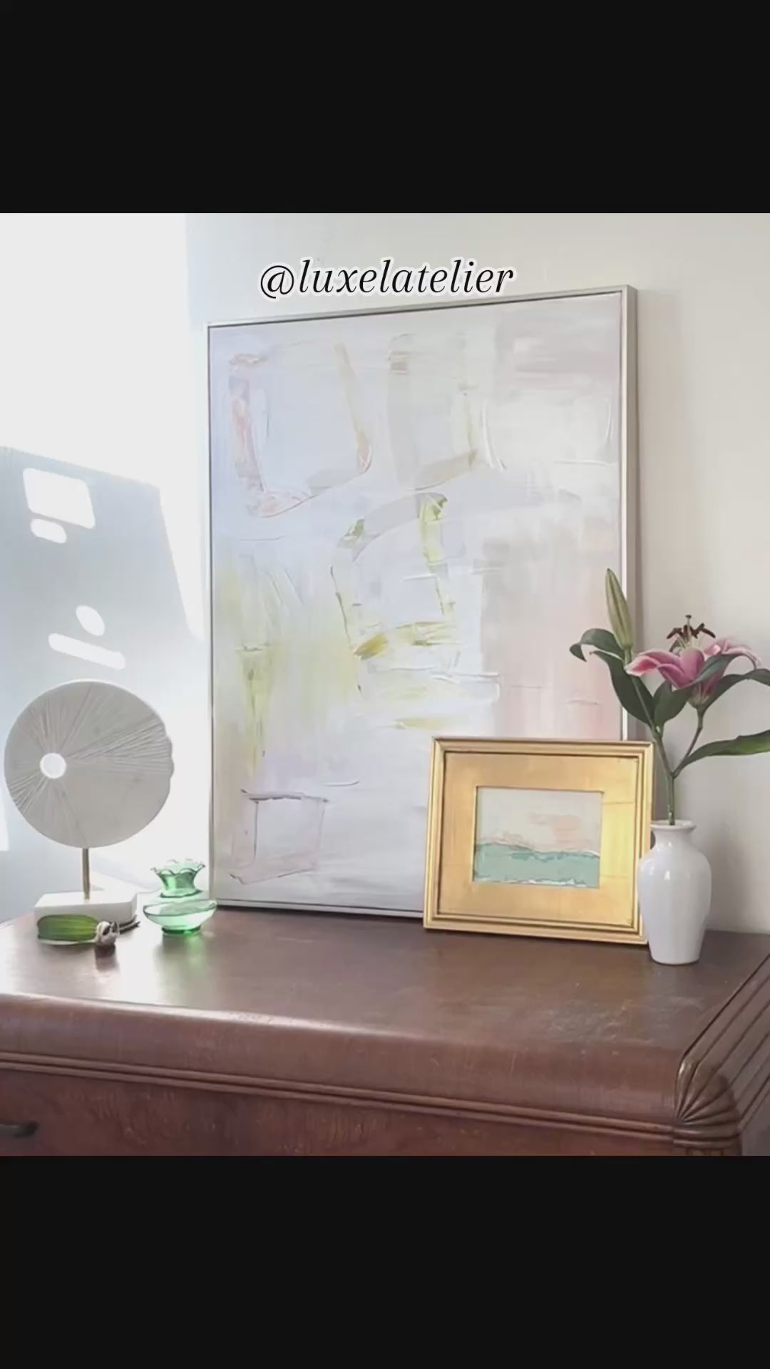 Original abstract mixed media painting on stretched canvas (size 24”x36”) framed in silver. The color palette is very neutral and includes shades of white, taupe, and peach undertones.